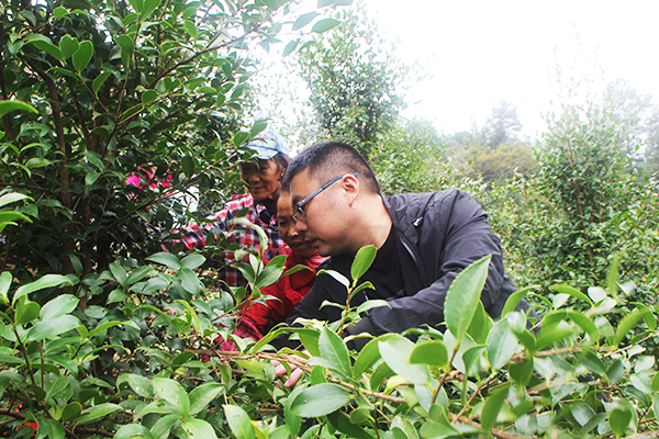 在剛剛采摘完油茶果的一株油茶樹旁,一位專家正在熱情洋溢地講解著油茶管護(hù)技術(shù)的“精要”,時(shí)不時(shí)還俯身下去指著油茶樹,向在場(chǎng)農(nóng)戶交流經(jīng)驗(yàn),分享管護(hù)心得。村民們將他團(tuán)團(tuán)圍住,認(rèn)真的聽著。
