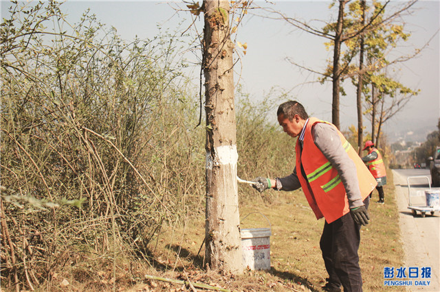 中國彭水網(wǎng)(融媒體記者 任 會 攝影)11月17日,在保家鎮(zhèn)工業(yè)園區(qū),園林工人正在對樹木進行“刷白”。據(jù)了解,為了使植被安全越冬,防止樹木遭受蟲害和凍害,縣工業(yè)園區(qū)利用晴好天氣對園區(qū)行道樹進行養(yǎng)護工作。