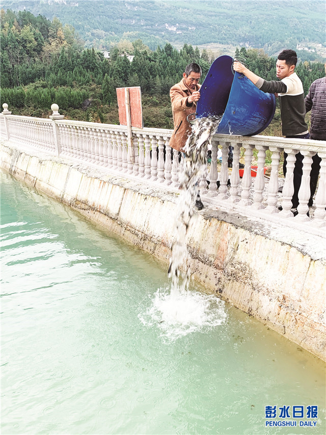 中國彭水網(融媒體記者 謝 慶 攝影)11月17日,在潤溪鄉(xiāng)巖角村魚塘,村民們正在投放魚苗。據(jù)了解,為進一步壯大村集體經濟,巖角村因地制宜,修建魚塘,引導村民走產業(yè)發(fā)展之路。目前,魚塘已經累計投放10000尾魚苗,為壯大村集體經濟奠定了基礎。