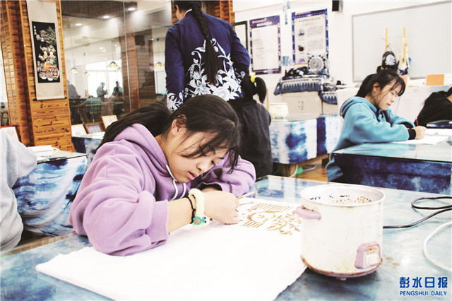 中國彭水網(wǎng)(融媒體記者 向玉婷 攝影)近年來,彭水注重民族文化教育,突出辦學(xué)特色,挖掘刺繡、蠟染、剪紙等傳統(tǒng)工藝,開設(shè)民族特色課堂,以學(xué)校教學(xué)為載體,開展民族文化教育教學(xué),傳承民族民間技藝,將民族文化與旅游相結(jié)合,推進全縣文旅融合發(fā)展。圖為縣職教中心學(xué)生正在學(xué)習(xí)苗族蠟染。