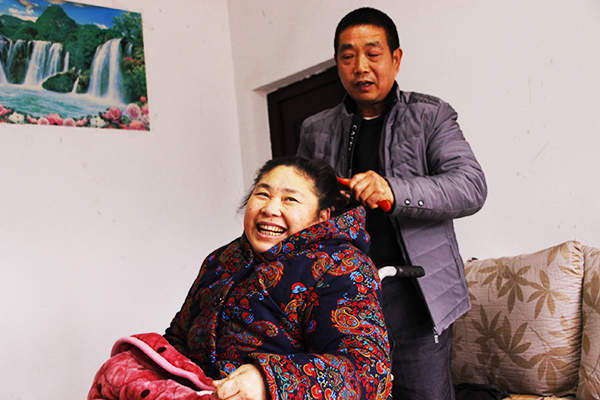 11月23日,小雪過后的鹿鳴鄉(xiāng)雙楓村日漸寒冷,但阮仕合的家里卻暖意融融。房間里,阮仕合輕聲地給妻子張家術(shù)說:“老張,我們梳頭了,輕輕梳哈?!比钍撕弦贿呎f著,一邊熟練地梳起妻子長長的秀發(fā)。話音剛落,坐在輪椅上的妻子張家術(shù),發(fā)出如孩童般的笑聲應(yīng)和著丈夫阮仕合。