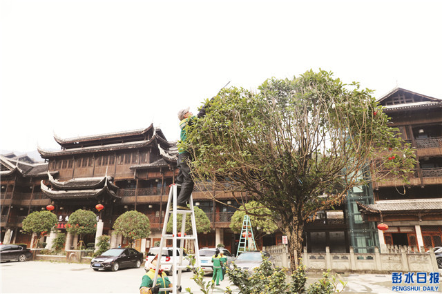 中國彭水網(wǎng)(融媒體記者 李亞軍 攝影)日前,蚩尤九黎城景區(qū),作業(yè)人員正對(duì)景區(qū)樹木進(jìn)行修枝剪枝,確保植物的正常生長(zhǎng)以及較好的景觀效果,進(jìn)一步加強(qiáng)彭水旅游景區(qū)綠化及周邊環(huán)境綜合整治工作,營(yíng)造安全、衛(wèi)生、整潔和舒適的游覽環(huán)境。
