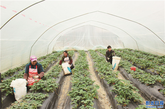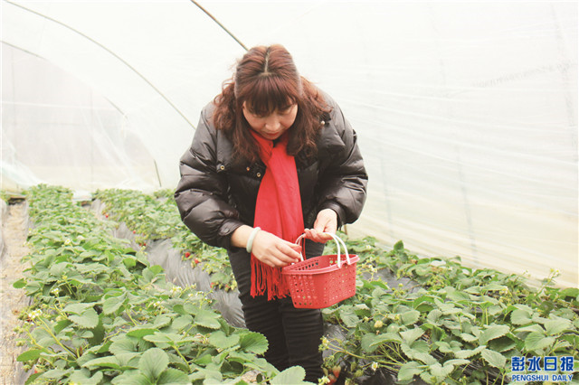 中國彭水網(wǎng)(融媒體記者 任 會 /文 陳興盛 任 會 /圖)1月7日,走進(jìn)紹慶街道阿依河社區(qū)勃希果園,一派生機(jī)盎然的景象,綠色葉子底下一串串紅彤彤的草莓果實已經(jīng)成熟,當(dāng)?shù)卮迕衽碓葡愫屯舸笥⒄诠麍@里忙著梳果、除草。