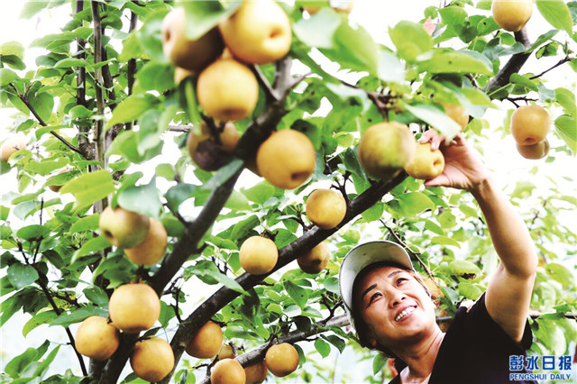 喬梓鄉(xiāng)發(fā)展經(jīng)果林產(chǎn)業(yè),游客前來采摘梨子。
