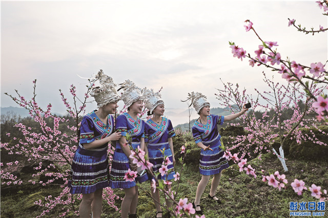 桃花開游客來,游客在長生鎮(zhèn)三合社區(qū)桃花林拍照留念。