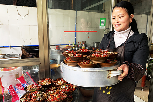 劉金彩介紹,十幾年前,她與丈夫結(jié)婚一起回到了彭水。2013年,一家人商量著在朱砂場開一家餐館,以便劉金彩在家照顧孩子增加家庭收入。餐館開起來了,可生意一直不溫不火。2016年,劉金彩發(fā)現(xiàn),當(dāng)?shù)卮迕袷窒矚g吃羊扣,經(jīng)常開車去很遠(yuǎn)的鄉(xiāng)鎮(zhèn)吃,這讓她有了做羊扣的想法。