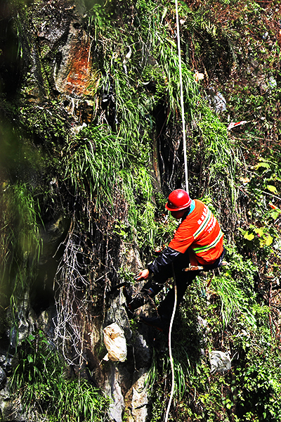 環(huán)衛(wèi)工人清理的懸崖,崖頂?shù)浇娲怪本嚯x100余米,在懸崖上清理垃圾危險性高,當天參加懸崖垃圾清理的4名環(huán)衛(wèi)工人都是經(jīng)過專業(yè)培訓(xùn)的。在垃圾清理現(xiàn)場,環(huán)衛(wèi)工人在崖頂固定安全繩,然后坐在滑板上依靠安全繩在懸崖上作業(yè),對所有清理的垃圾進行收集,再用清漂船轉(zhuǎn)運。