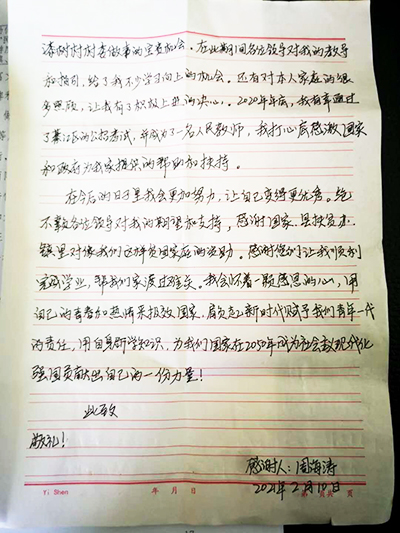 “在漆樹村村民委工作,能照顧家庭,這給了我很大的鼓勵,也激勵著我不斷上進。”周海濤在信中寫道,在村民委工作的同時他也積極學習。2020年底,周海濤順利通過了重慶市綦江區(qū)的教師公招,成為了一名人民教師。