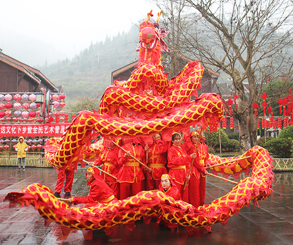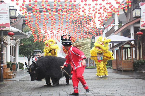 活動(dòng)現(xiàn)場(chǎng),一時(shí)鑼鼓喧天,只見(jiàn)一名表演者牽牛、兩名表演者玩牛,兩個(gè)人將栩栩如生的黑牛道具披在身上,在牽牛人的逗弄下,時(shí)而發(fā)怒、時(shí)而撒歡、時(shí)而老實(shí);舞動(dòng)的“雄獅”雙眼靈動(dòng),外形俊俏,大嘴張合有度,時(shí)而搖頭擺尾、昂首仰視,時(shí)而俯身匍匐,舞姿妙趣橫生;游動(dòng)的“巨龍”也毫不遜色,蛟龍漫游、蛻皮、鉆節(jié)、追珠,一個(gè)個(gè)經(jīng)典動(dòng)作被舞龍者展現(xiàn)得淋漓盡致。期間,吹嗩吶、玩牛、烏江號(hào)子等傳統(tǒng)藝術(shù)表演博得現(xiàn)場(chǎng)觀眾拍手叫絕。