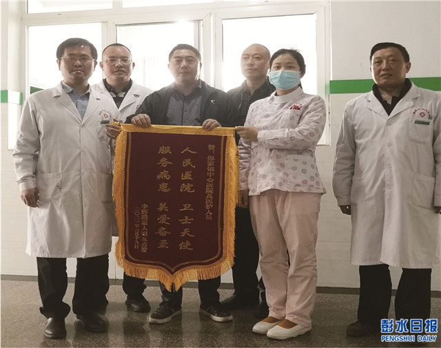 中國彭水網(wǎng)(通訊員 陳 欠) 4月28日,在保家鎮(zhèn)中心衛(wèi)生院內(nèi),一對李姓兄弟將印有“人民醫(yī)院 衛(wèi)士天使 服務(wù)病患 關(guān)愛備至”的錦旗送到醫(yī)護(hù)人員手中。