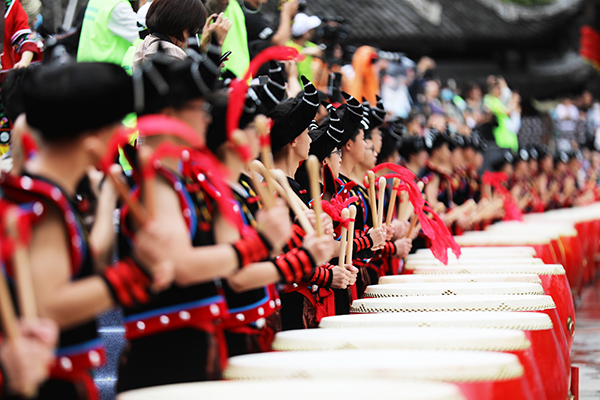 苗鼓飛揚,龍騰獅躍,伴隨豪邁而雄渾的鼓點,苗鄉(xiāng)兒女矯健而勇武的身姿展現(xiàn)在眾人面前。