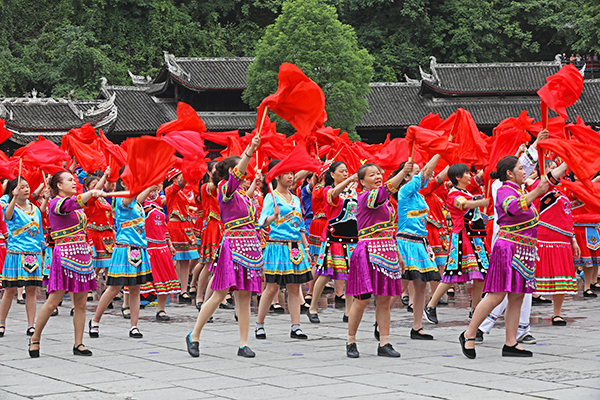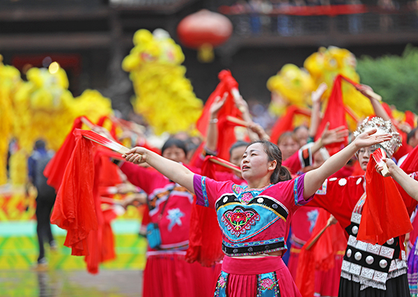 古色古香的蚩尤九黎城苗戲樓前,苗歌此起彼伏、抑揚頓挫,有張有弛,充分展示了苗鄉(xiāng)兒女們對生活的熱愛和勤勞質(zhì)樸、奮發(fā)向上的人生態(tài)度,也體現(xiàn)了彭水人民對美好新時代的感恩,對美好生活的新希望。