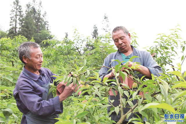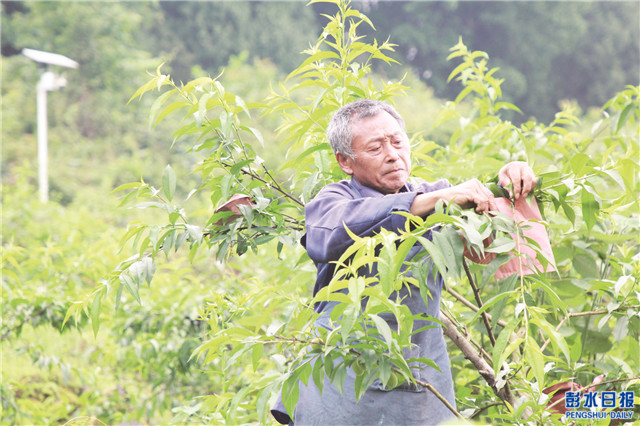 重慶彭水網(wǎng)(融媒體記者 陳興盛 黃智宇 張茂玉 文/圖) 日前,在長生鎮(zhèn)三合社區(qū)黃桃觀光園里,一個(gè)個(gè)果子已掛滿枝頭,桃林間,20多名村民正忙碌著,為黃桃疏果套袋。