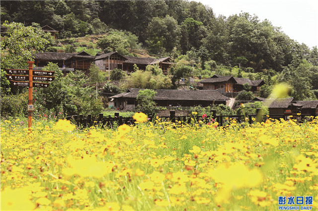 重慶彭水網(wǎng)(融媒體記者 廖 唯 攝影)6月8日,初夏時節(jié),鞍子鎮(zhèn)羅家坨苗寨的黃金菊盛開,與古色古香苗寨建筑相映成趣,好似一幅美麗田園畫。
