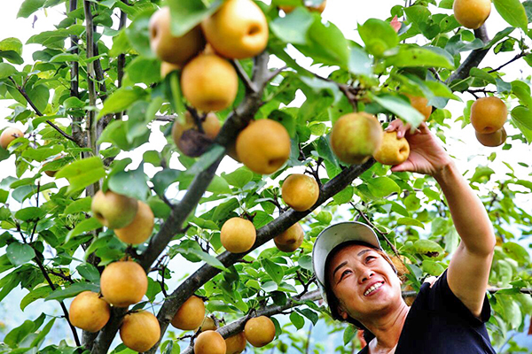 喬梓鄉(xiāng)發(fā)展經(jīng)果林產(chǎn)業(yè),游客前來采摘梨子。