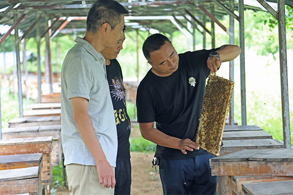 韓慶勇(左一)在察看中蜂生長情況。 融媒體記者 蔡 秀 攝影
