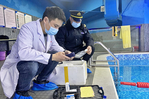 重慶彭水網(wǎng)(通訊員 譚瑤)12月15日,縣衛(wèi)生健康綜合行政執(zhí)法支隊聯(lián)合縣疾控中心對我縣兩家常年開放性游泳池進(jìn)行現(xiàn)場監(jiān)督檢查,預(yù)防傳染性疾病通過游泳場所傳播和流行,達(dá)到保護(hù)公眾身體健康的目的,為廣大市民營造一個衛(wèi)生舒適的游泳環(huán)境。圖為疾控中心工作人員對游泳池水質(zhì)進(jìn)行采樣。