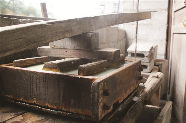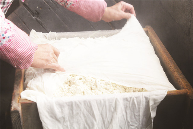 選好的豆子需要加水浸泡4-6個小時,冬季浸泡時間還需延長。豆子浸泡好后,用石磨磨成豆?jié){,再將豆?jié){放入鍋內(nèi),煮沸后用濾布過濾掉豆渣。濾掉豆渣的同時,往豆?jié){里加入膽水,整個過程連貫、一氣呵成。熱氣氤氳中,豆?jié){悄悄發(fā)生著變化,凝結(jié)成了豆花。緊接著,將豆花倒入木盒,濾掉水分,用濾布收緊邊沿,蓋上蓋子,壓上重物,靜置一小時以上,讓松散的豆花變得緊實,之后便形成了豆腐。