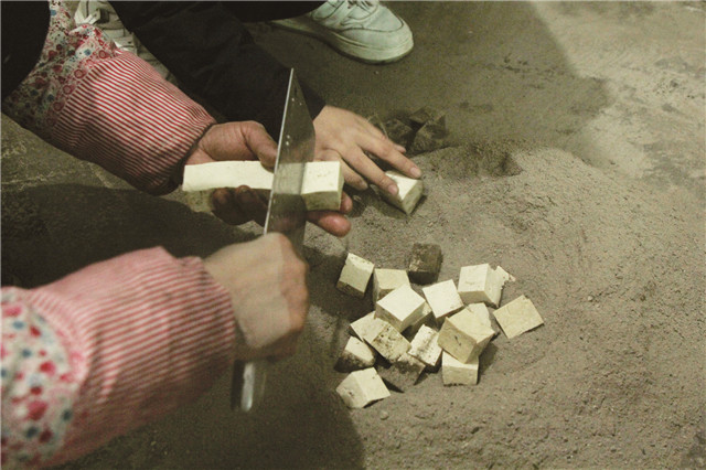 百草灰是制作“灰豆腐”的重要食材,制作時,首先用簸箕篩除草木灰中的渣滓,再將濾干水分的豆腐切成小塊,放入篩過的百草灰中,靜置一夜,使豆腐變得干硬。接下來,在冷鍋中倒入百草灰和豆腐翻炒,便制成了“灰豆腐”。