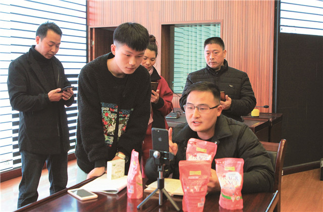 王元東(右一)和他的團隊正在直播帶貨。 融媒體記者 謝豫川 攝影