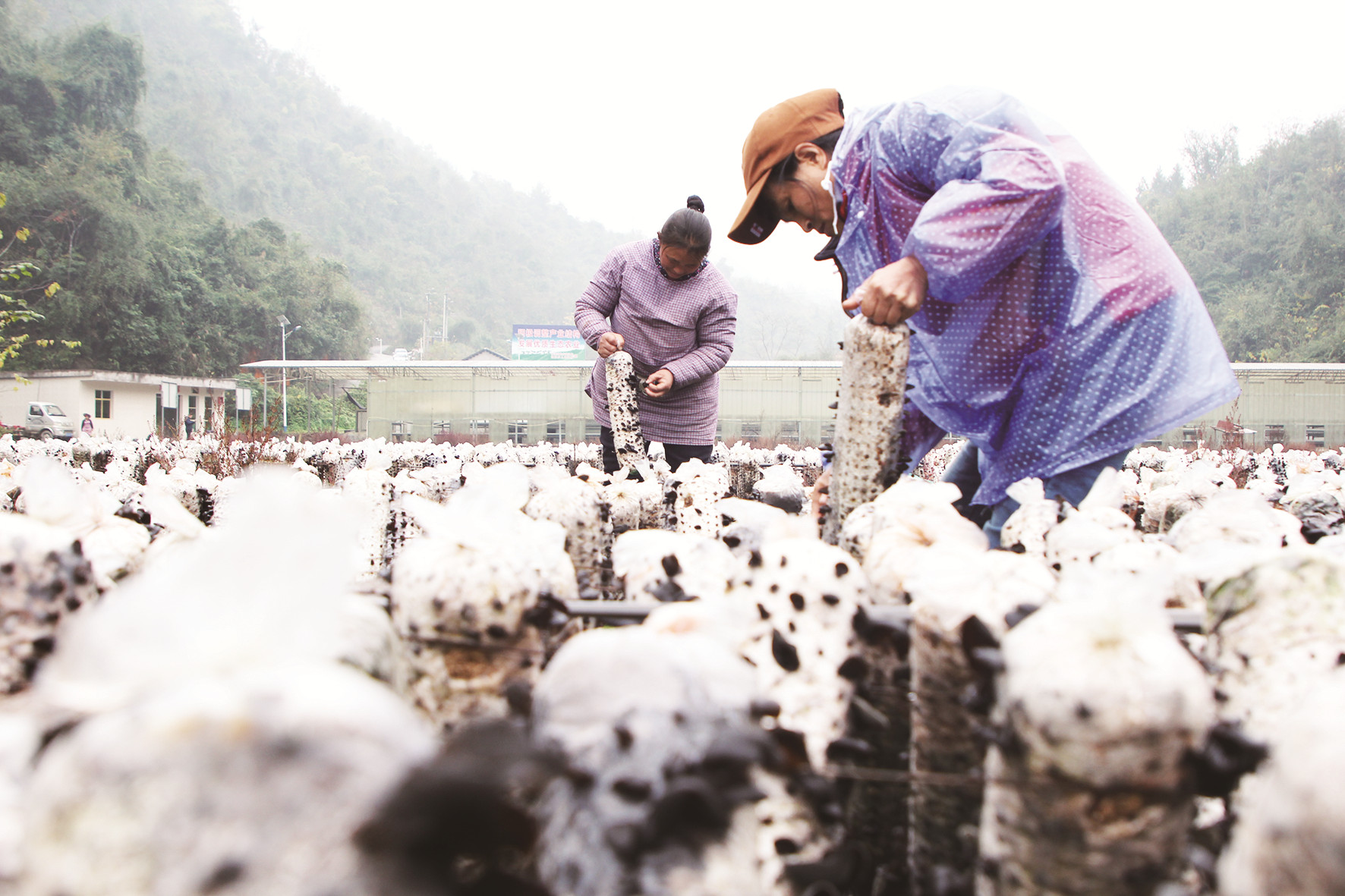 小坪村木耳種植基地農(nóng)戶在采摘鮮木耳。