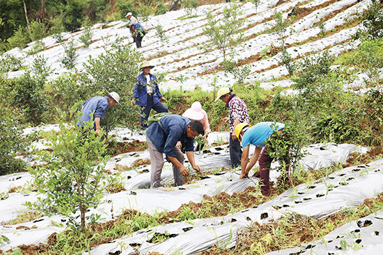6月的清晨,山林疊翠、鳥語啾啾。霧氣剛散,就見善感鄉(xiāng)桂花村2組黃精基地里,100余名村民正忙而有序地栽種黃精苗。