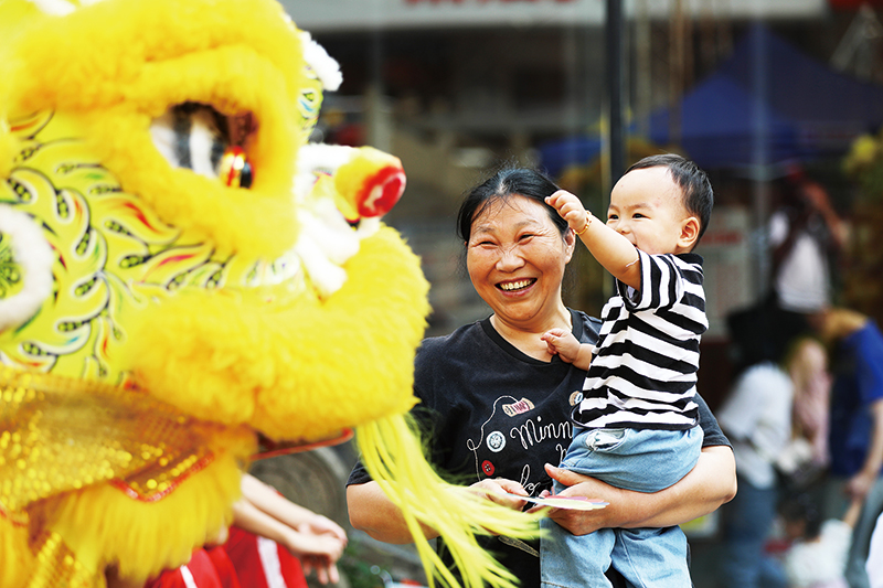 舞獅表演的演員正在與群眾互動(dòng),逗樂(lè)小朋友。