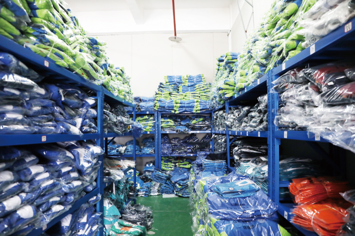 記者看到,成品展廳內(nèi),各類定制校服、工作服、民族服裝、T恤等種類齊全,原材料區(qū)布料碼放整齊。