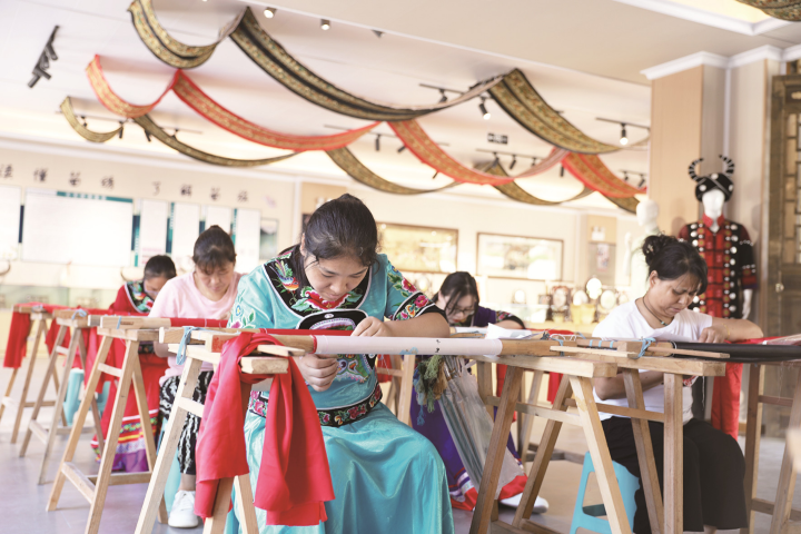 重慶彭水網(wǎng)(融媒體記者 李亞軍)近年來,我縣通過“文旅+”深度融合引領(lǐng),深入挖掘苗繡這一傳統(tǒng)技藝,大到景區(qū)景點(diǎn)、苗族服飾,小到荷包、吊墜、字畫,一件件苗繡作品變成商品,帶動群眾增收。同時,在蚩尤九黎城等景區(qū)景點(diǎn)還打造了苗繡樓和苗繡工坊,讓游客在游覽之余,能夠近距離參觀或體驗彭水苗繡這一非遺項目。圖為蚩尤九黎城苗繡館,學(xué)員正在學(xué)習(xí)苗繡。
