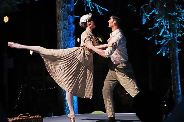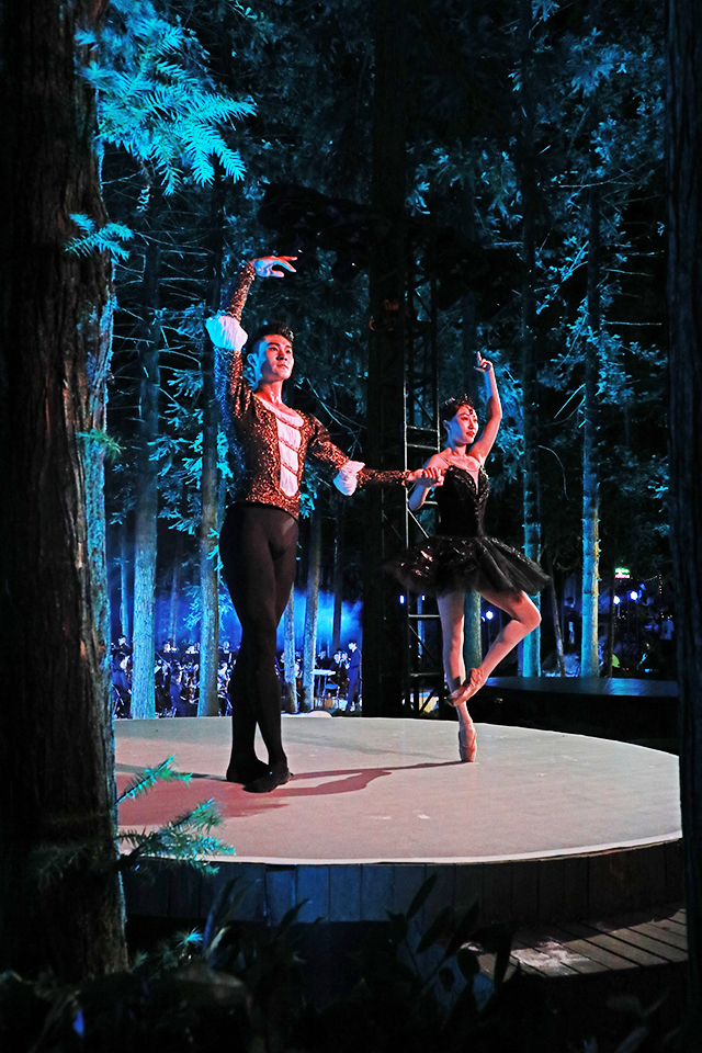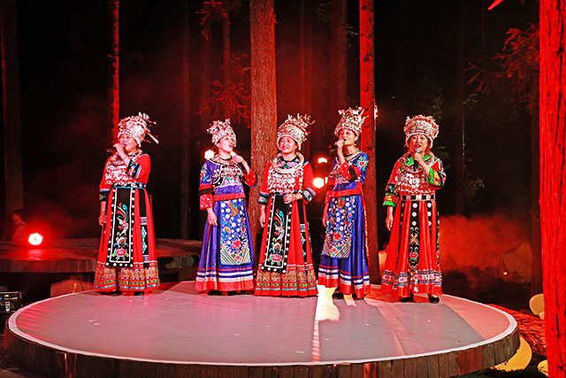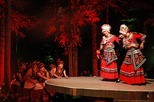 圓形舞臺(tái)掩映在郁郁蔥蔥的林間,在紅色、紫色、藍(lán)色等燈光的映襯下變得如夢(mèng)如幻,觀眾散布在林中觀看演出。