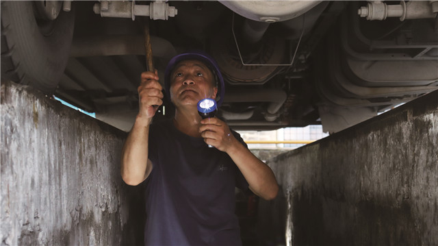 下午兩點(diǎn)多,是一天中氣溫最高的時候,羅應(yīng)文不僅要接受地溝高溫的炙烤,還要接受客車發(fā)動機(jī)和排氣管高溫的烘烤,雖然很熱,但檢查轉(zhuǎn)向、輪胎、剎車等各項(xiàng)工作,羅應(yīng)文一個環(huán)節(jié)也不減少。一輛車檢查下來,他已是滿頭大汗,如果遇到忙碌的時候,工作服全部汗?jié)瘛?/p>