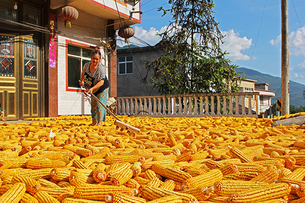 重慶彭水網(wǎng)(融媒體記者 鐘 建 攝影 )眼下正值農(nóng)作物收獲時(shí)節(jié),我縣低海拔地區(qū)玉米均已成熟,農(nóng)民趁著晴好天氣進(jìn)行搶收、晾曬,田間地頭、房前屋后一片金黃,呈現(xiàn)出一派豐收景象。圖為普子鎮(zhèn)普子壩社區(qū)8組村民正在翻曬玉米。