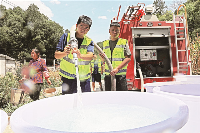 桑柘鎮(zhèn)組織干部職工,用消防車為缺水的村莊送水到家門口。趙 勇 攝影