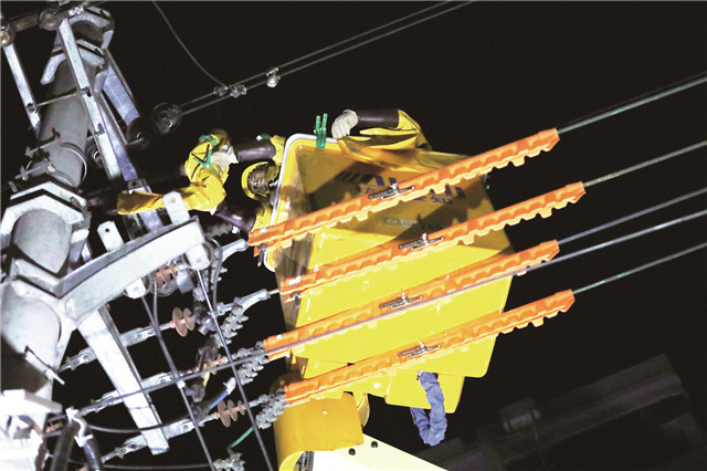 國網(wǎng)彭水供電公司電力工作人員在漢葭街道沙沱社區(qū)進(jìn)行帶電作業(yè)。 廖唯 攝影