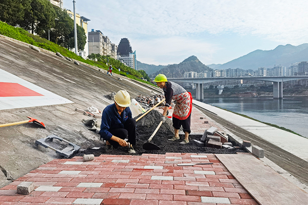 重慶彭水網(wǎng)(作者:趙琴)9月6日,工人正在烏江西路河堤步道鋪設(shè)地磚。今年來,我縣對烏江西路河堤步道進(jìn)行升級改造,鋪設(shè)地磚,此項(xiàng)目全長為3160米,新鋪設(shè)彩色漏水磚、新建混凝土健身步道,項(xiàng)目實(shí)施既提升城市品質(zhì),又讓市民散步休閑更舒適。