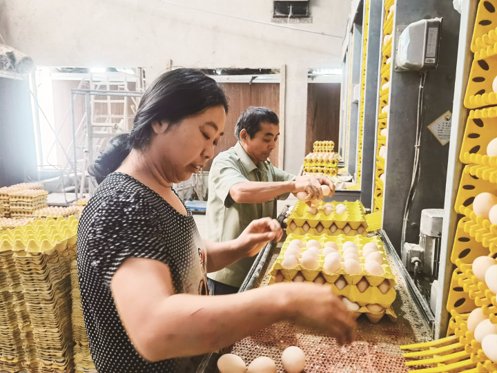 9月14日,在紹慶街道過江村4組的彭水天軍養(yǎng)雞場,一個個雞蛋正通過自動撿蛋系統(tǒng),滑到分揀包裝盤中,“雞倌”張?zhí)燔娬炀毜貙⒁幻睹峨u蛋分揀裝盤。在他身后,一排排雞籠整齊排列,1萬羽蛋雞伸著脖子啄食,嘰嘰喳喳,好不熱鬧。
