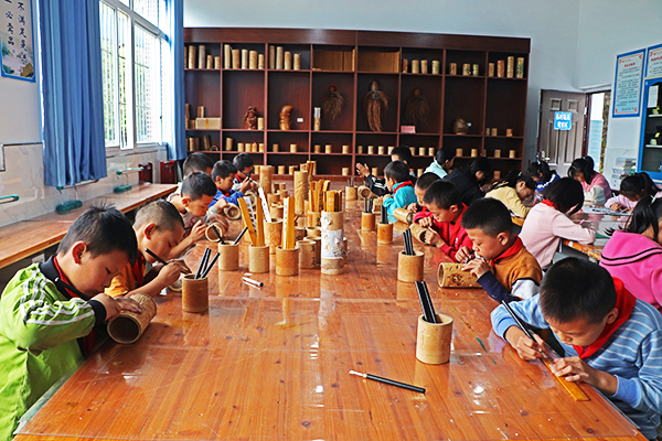 萬(wàn)足中心校校長(zhǎng)張芬介紹:“在抓實(shí)文化課程的基礎(chǔ)之上,學(xué)校設(shè)立了竹刻、剪紙、刺繡、籃球、足球等10多個(gè)特色課程,豐富學(xué)生的課余生活,培養(yǎng)他們的興趣愛好?!?/p>