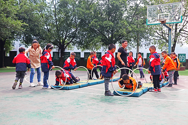 初冬時(shí)節(jié),在萬(wàn)足中心校操場(chǎng),學(xué)生們正在進(jìn)行課間體育活動(dòng),有的在轉(zhuǎn)呼啦圈,有的在打籃球,有的在跳繩,有的在踢足球……在綠樹掩映下充滿了生機(jī)和活力。