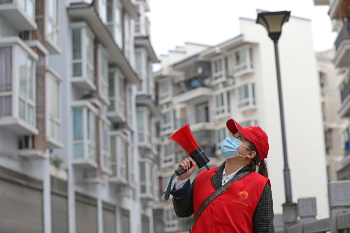 志愿者正在通過(guò)小喇叭,向居民宣傳疫情防控措施。