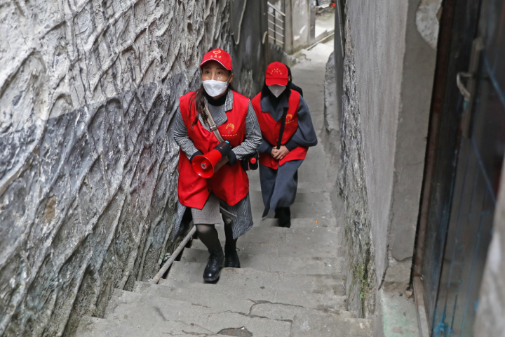 志愿者正在走街串巷開(kāi)展疫情防控宣傳。