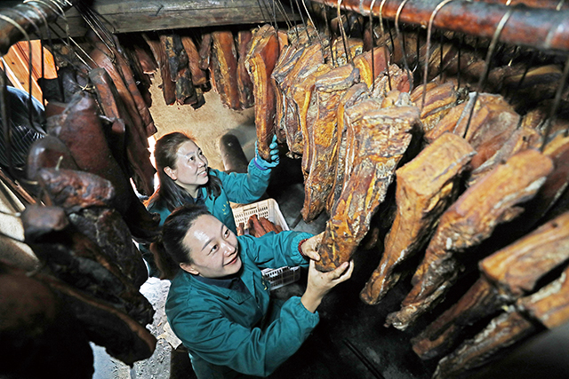 朱靜堂那頭300多斤的肥豬,也將在工人的手下變成美味的臘制品。那塊寄往德國(guó)的臘肉,正來(lái)源于此。