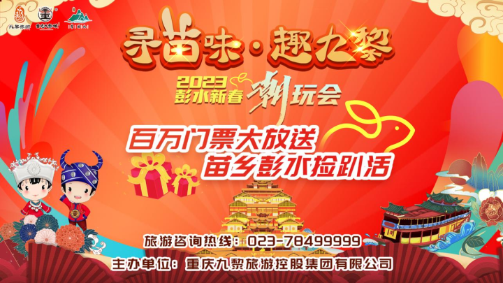 2023年春節(jié)期間,苗鄉(xiāng)彭水將推出“尋苗味·趣九黎”2023新春潮玩會(huì)活動(dòng),從除夕直至元宵,耍事多、優(yōu)惠多、趴活多,邀您一起來(lái)苗鄉(xiāng)彭水迎新春過(guò)大年!