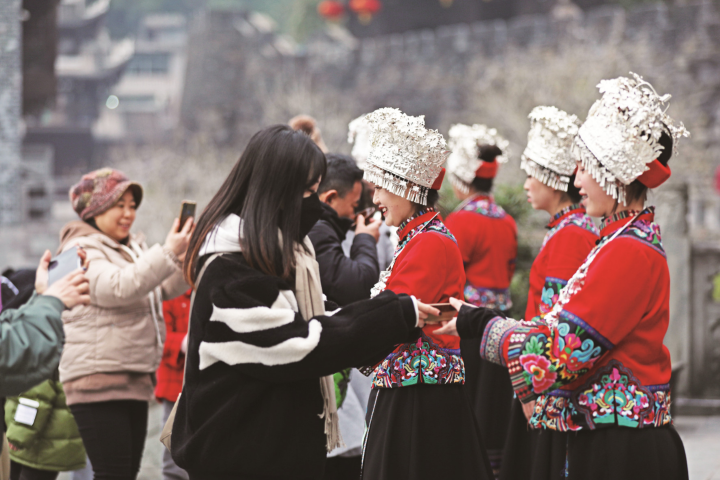 掛燈籠、貼春聯(lián)、舞龍獅、跳花燈等各種春節(jié)元素紛紛亮相,彰顯了歡樂喜慶的節(jié)日氛圍。在蚩尤九黎城、阿依河、摩圍山等景區(qū)以及各鄉(xiāng)村旅游點(diǎn),眾多游客前來感受苗鄉(xiāng)獨(dú)特的年味,樂享春節(jié)假期。
