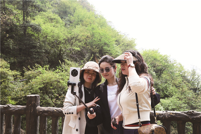近日,天氣晴好,記者在摩圍山景區(qū)看到,景區(qū)內(nèi)游客成群結(jié)隊,或在林中漫步,或找個地方坐下休息;年輕人多選擇在景區(qū)設(shè)計的打卡點(diǎn)自拍留影。