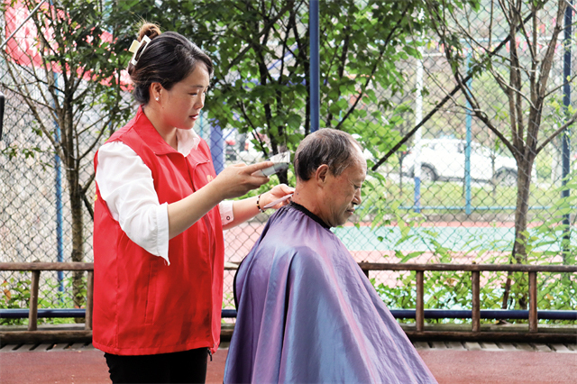 現(xiàn)場,大埡鄉(xiāng)衛(wèi)生院的醫(yī)護人員為留守老人開展義診活動,村民紛紛前來咨詢,醫(yī)護人員耐心地為他們測量血壓、血糖監(jiān)測,并根據(jù)病情,及時給予醫(yī)療幫助和心理疏導;同時,組織理發(fā)店工作人員現(xiàn)場為留守老人、兒童開展愛心義剪,理發(fā)師認真詢問他們的需求,根據(jù)他們的喜好和要求精心修剪。