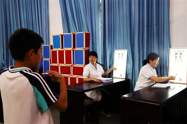 驗(yàn)光師正在為學(xué)生做視力檢查。