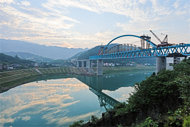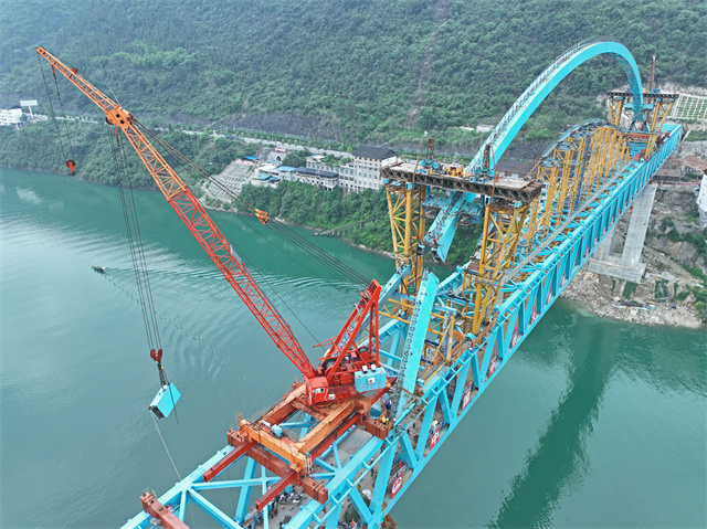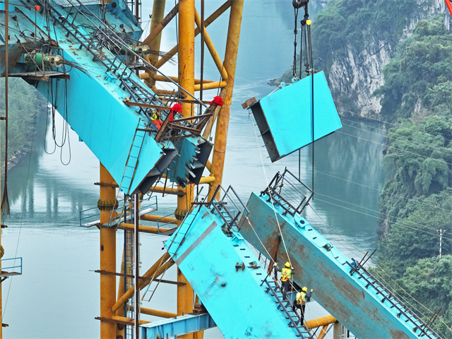6月8日,在漢葭街道渝湘高鐵彭水段清水坪烏江大橋建設(shè)現(xiàn)場,正在吊裝拱肋,為合龍做最后的準備工作。