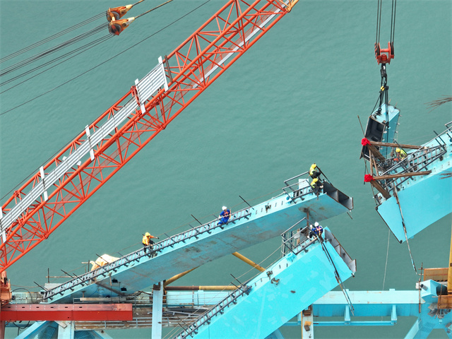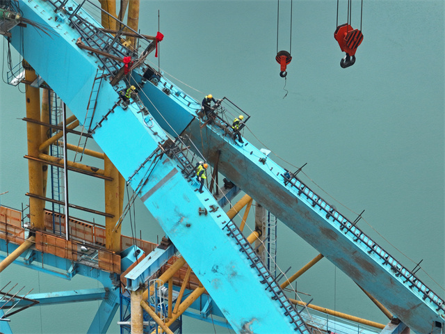 工人正在抓好拱肋部件修整,為拱肋提升合龍做好準備。