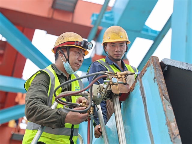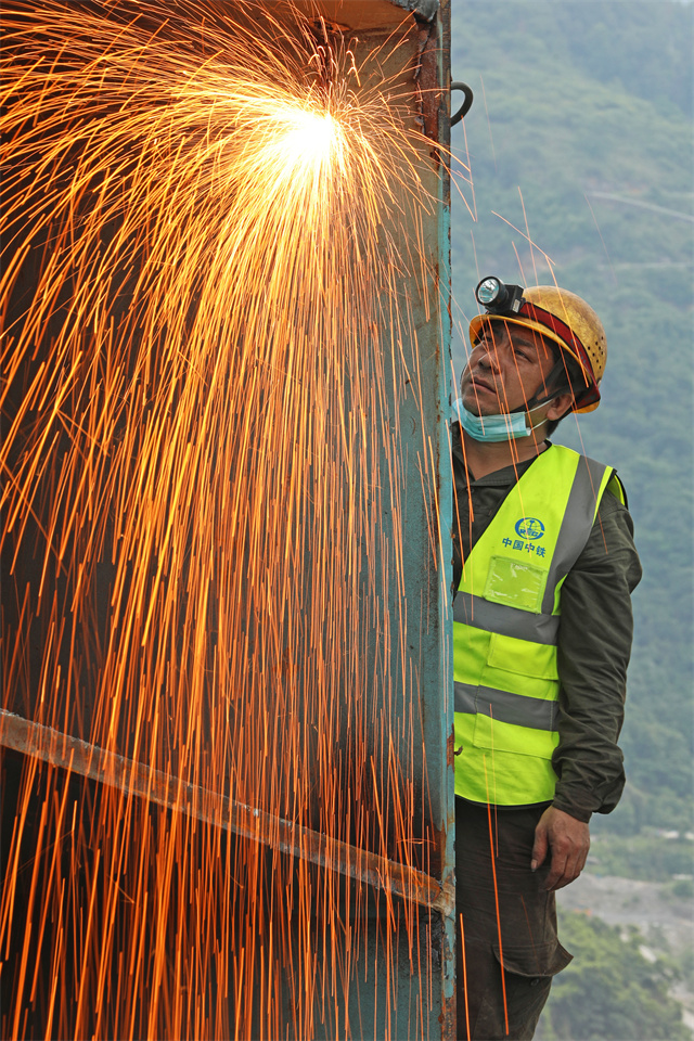 工人正在對拱肋合龍段進行焊接,標志著渝湘高鐵清水坪烏江大橋拱肋順利提升合龍。