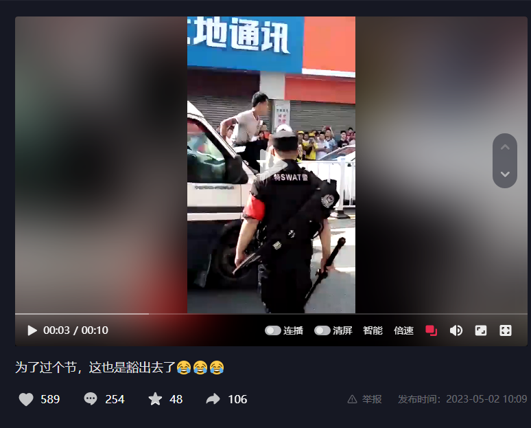 5月2日,“重慶網(wǎng)警”在工作中發(fā)現(xiàn),有網(wǎng)民在某短視頻平臺連續(xù)發(fā)布了兩則疑似一持刀男子與警察對峙及特警抓捕嫌疑人的短視頻,并配以文字: